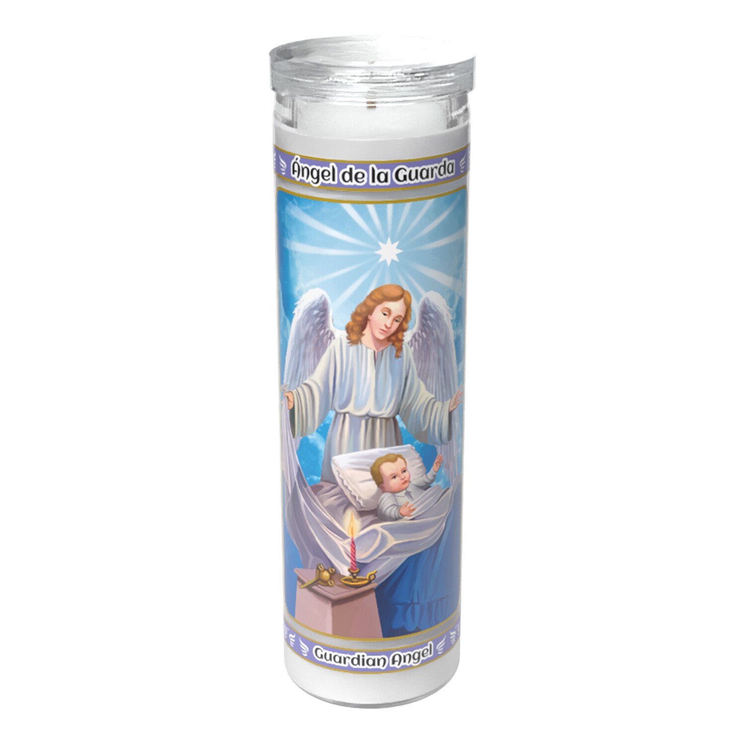 This 8 inch tall glass jar candles feature the Guardian Angel and are ideal for novena, candlelight vigils, and other spiritual practices. Unscented white wax is enclosed in a tall glass jar and designed to burn continuously over long periods of time.